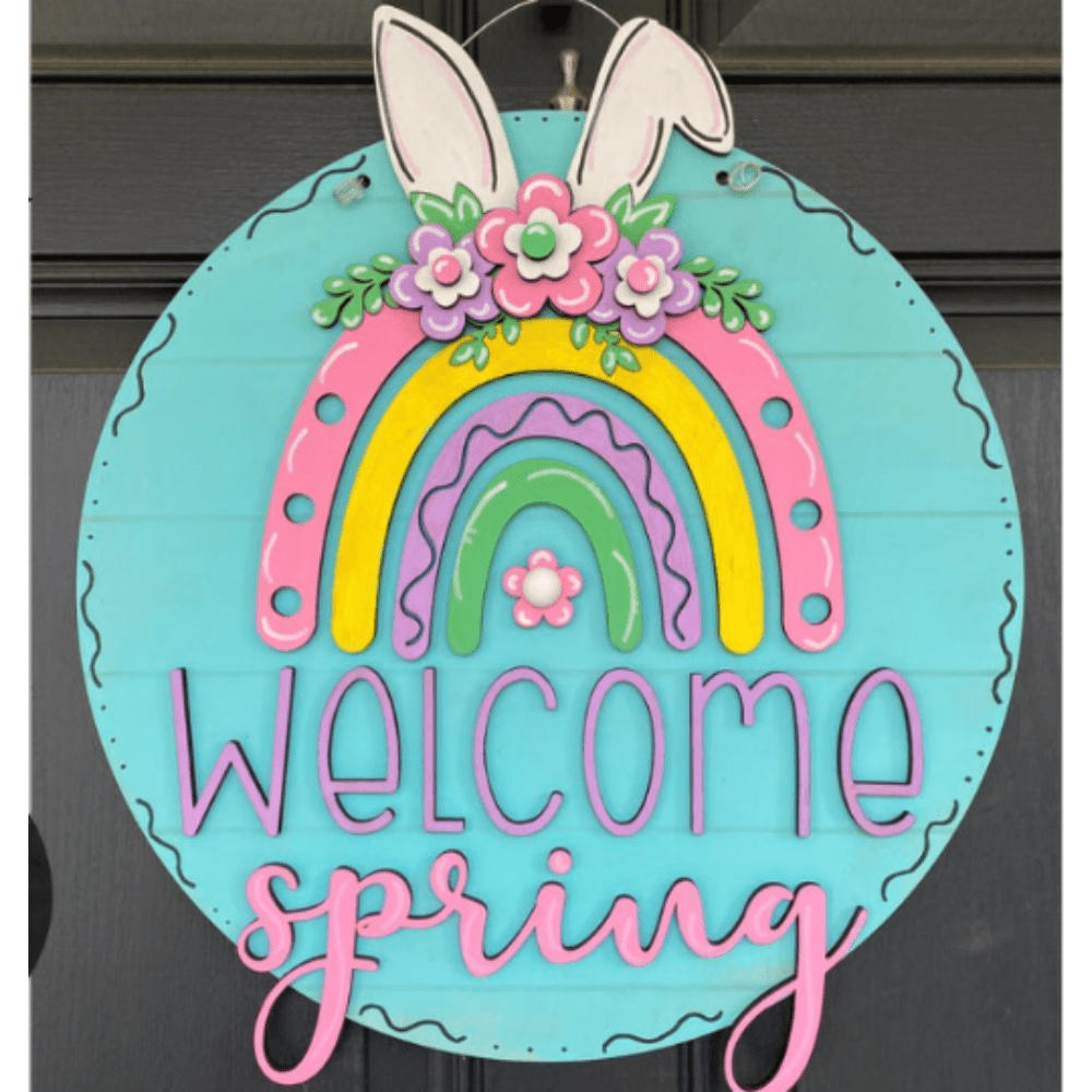 Boho Rainbow Bunny Spring Welcome Door Hanger SVG File Digital Laser Wood Glowforge template