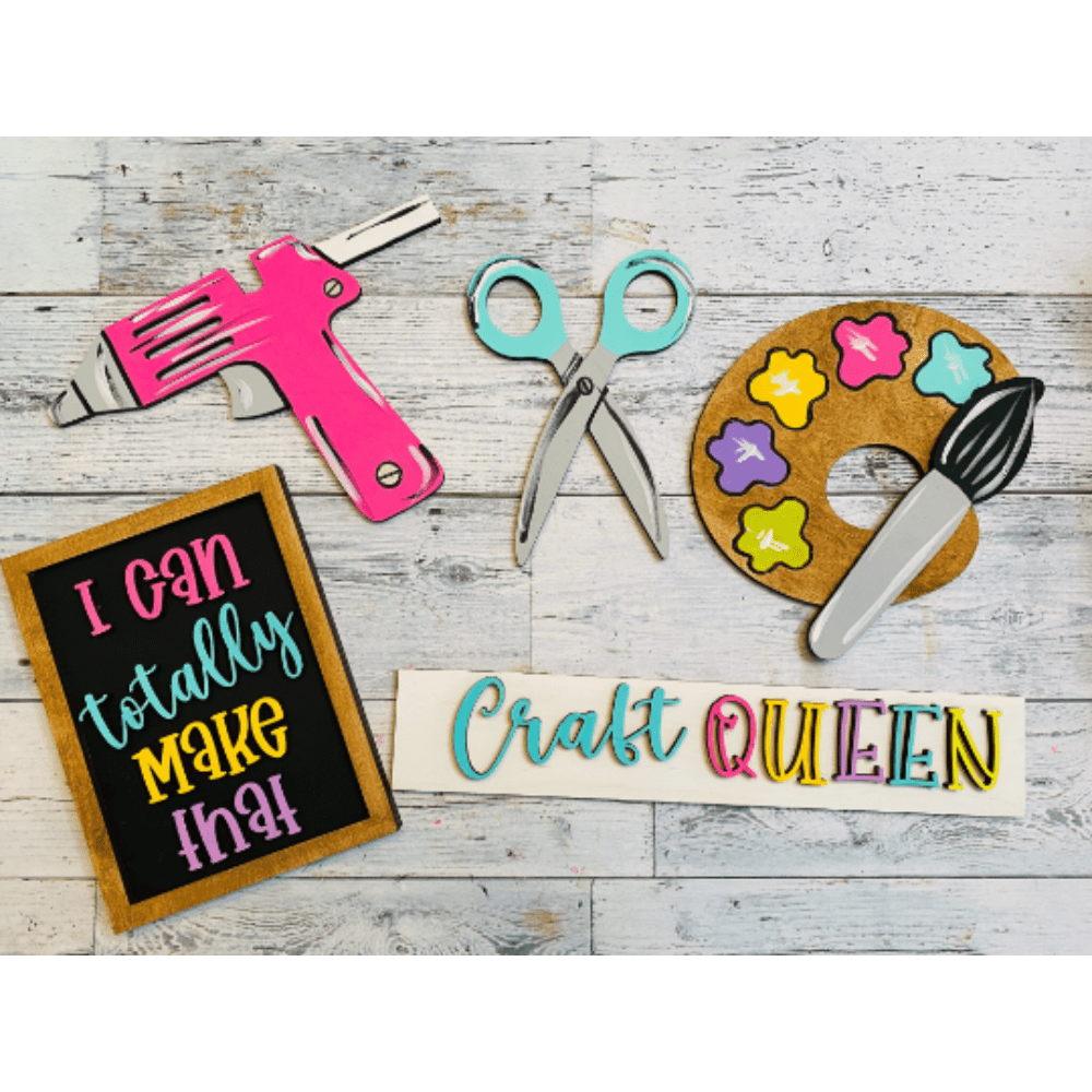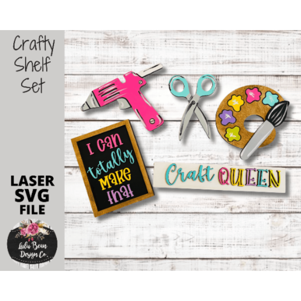 Crafty Queen Shelf Sitter Set Crafts Glue Scissors Paint SVG Wood Glowforge Digital Cut File Laser Wood Cutting Interchangeable