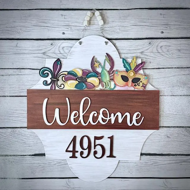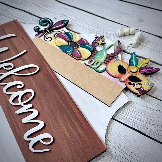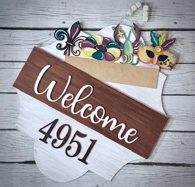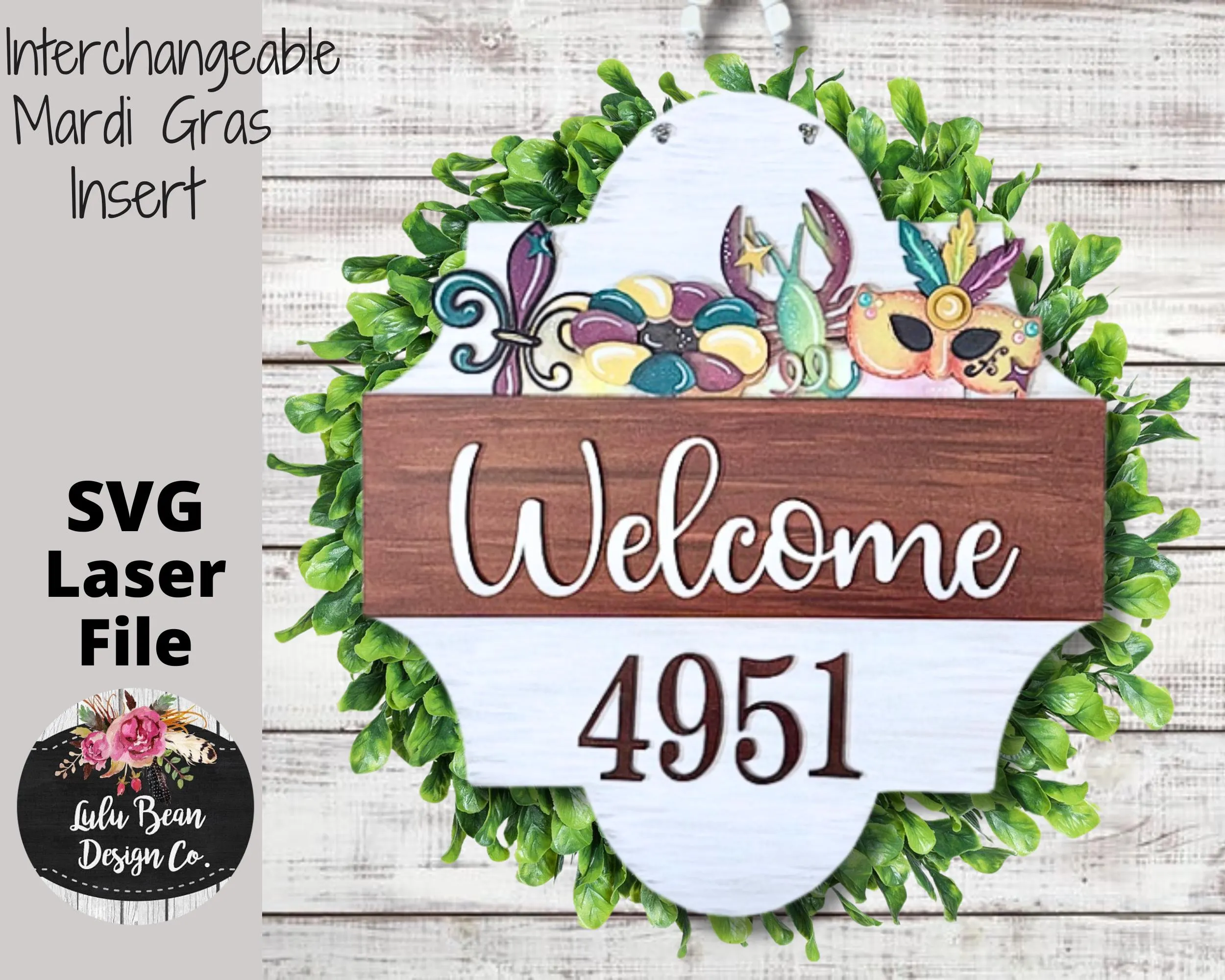 Mardi Gras Interchangeable Seasonal Door Hanger Insert Welcome Address Numbers Laser Glowforge Cut File SVG Wood Template